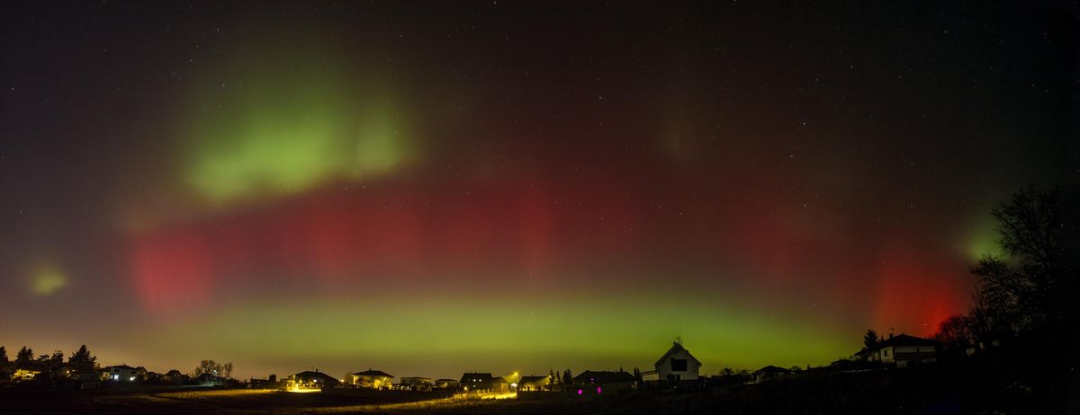 V závoji červených odstínů aurory se na obloze objevily v našich končinách velmi vzácné, rychle pulzující zelené skvrny (v angličtině známé jako aurora bloobs). Tuto zvláštní a raritní podívanou způsobil neobvykle vysoký obsah protonového materiálu procházejícího zemskou magnetosférou.