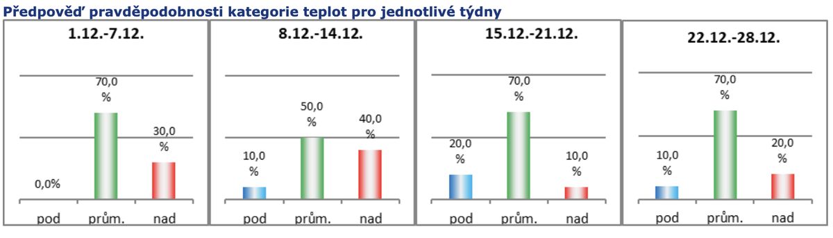 I druhý prosincový týden (8. až 14. 12.) bude s největší pravděpodobností s nadprůměrnými nebo průměrnými teplotami. Tento týden by také mohl být deštivý, ale žádné vysoké úhrny se nečekají. Na horách budou srážky sněhové.