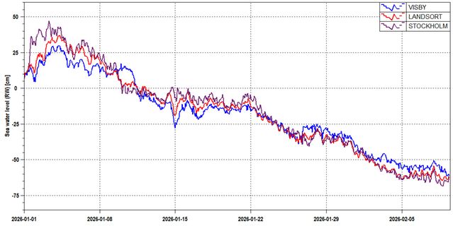 V neděli 8. února zaznamenal rekordně nízkou hladinu Baltského moře také Stockholm, kde byla hladina vody o několik desetin centimetrů nižší než byla průměrná vodní hladina v roce 1972. Nejníže byla hladina 69,7 cm pod průměrnou hladinou moře, což je jen kousek od absolutního rekordu 71,5 cm, který byl naměřen 20. března 1888.
