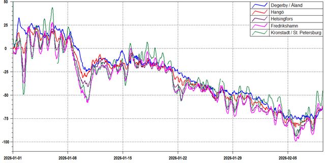 Ještě níže klesla hladina ve Finském zálivu. Na stanici Hamina zaznamenali 6. února hodnotu 99 cm pod průměrnou hladinou moře. Podle SMHI zaznamenala v posledních dnech většina stanic v jižním Finsku rekordně nízké hodnoty.
