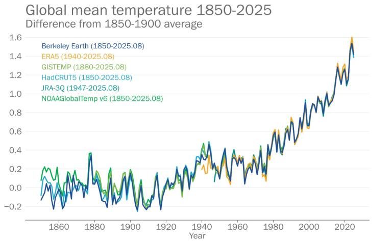 Posledních 11 let (2015 až 2025) bude patřit mezi jedenáct nejteplejších let v 176leté historii pozorování. Poslední tři roky navíc budou nejteplejšími lety v historii. Průměrná teplota v lednu až srpnu 2025 byla o 1,42 °C ± 0,12 °C vyšší než průměr v předindustriálním období (teploty v období 1850 až 1900), uvádí zpráva WMO.