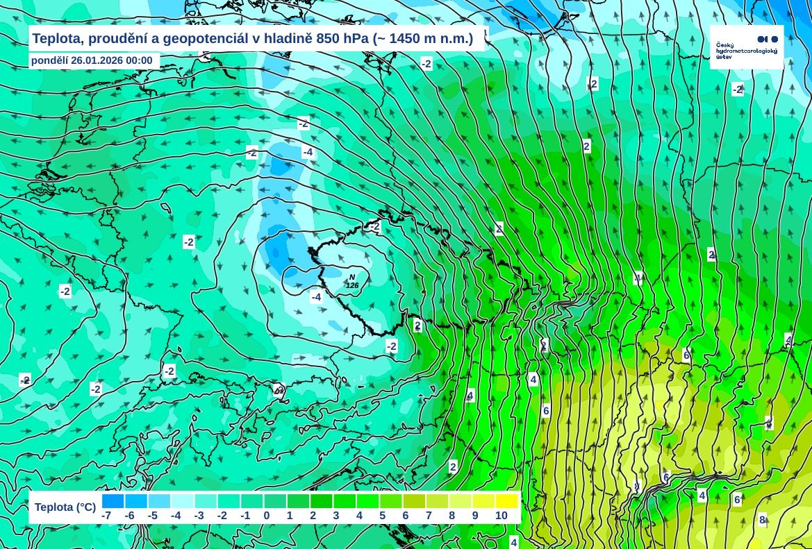 Střed této tlakové níže by měl v noci na pondělí přecházet přes naše území a přinese výrazné rozdíly v teplotních podmínkách. Vzhledem k tomu, že celorepublikový průměr teplot se bude pohybovat kolem nuly, bude se výrazně lišit i skupenství srážek.