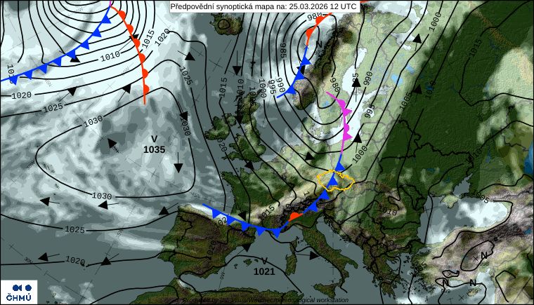 Výběžek vyššího tlaku vzduchu se nejprve postará o polojasnou až skoro jasnou oblohu. V teplejším jihozápadním proudění budou odpolední maxima šplhat na 12 až 17 °C. Ve středu odpoledne začne zesilovat vítr a od severozápadu do Česka doputuje zvlněná studená fronta, která večer přinese přeháňky a v Čechách výjimečně i zabouří.