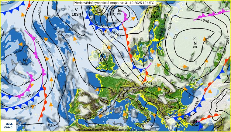 Nový rok nabídne po ránu místy i polojasnou oblohu s minimálními teplotami mezi -1 až -5 °C, v údolích a při bezvětří až kolem -8 °C. Během dne se na většině území zatáhne a v severní polovině republiky se přidá občasné sněžení, pod 300 metrů i déšť se sněhem. Odpoledne se rtuť teploměru vyšplhá na -2 až +2 °C a foukat bude mírný, později až čerstvý západní vítr. Od středních poloh se opět mohou tvořit sněhové jazyky, na horách i závěje.