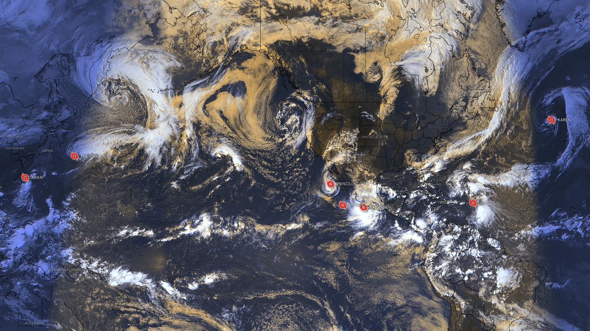Nejvíce jich je momentálně v Pacifiku. Na jeho západě aktuálně řádí dva tajfuny s téměř identickou trajektorií. Halong v současné době slábne poté, co jako tajfun nejvyšší kategorie prošel kolem japonského pobřeží poblíž Tokia. Nakri by měl být slabší, přesto ale do stejného regionu přinese vydatné srážky a silné poryvy větru.