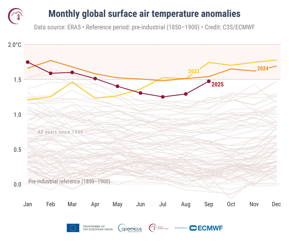 Zatímco tempo globálního oteplování od začátku roku zpomalovalo, v posledních dvou měsících znovu roste. V září byla průměrná globální teplota o 1,47 °C vyšší než odhadovaný průměr předindustriální éry (1850–1900).
