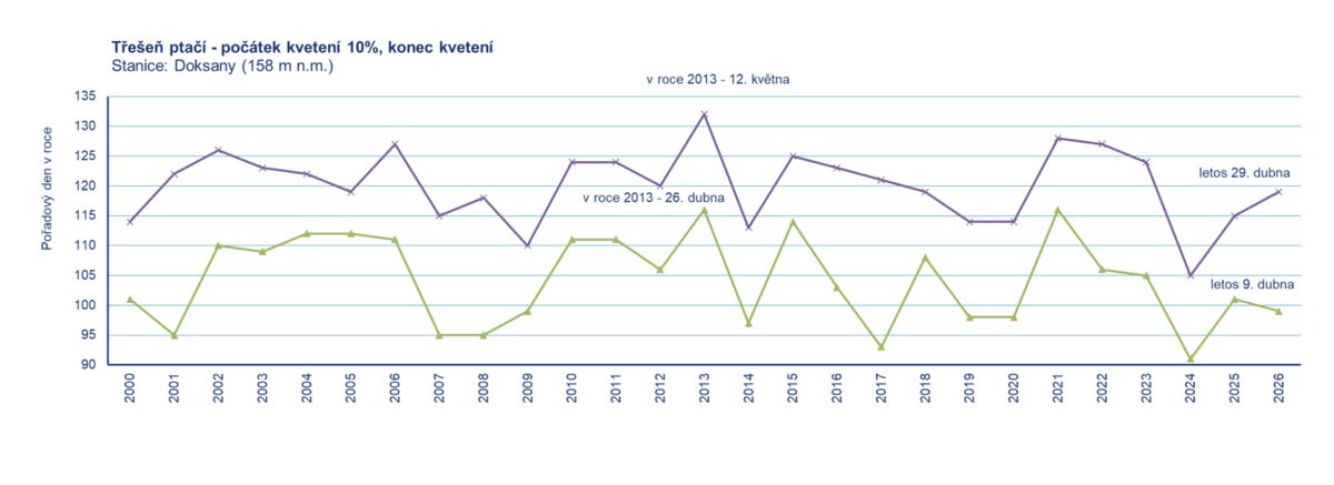 „Na stanici Doksany u Litoměřic (158 m n. m.) začala třešeň v posledních pěti letech kvést 26. dubna 2021, 16. dubna 2022, 17. dubna 2023, v roce 2024 dokonce už 1. dubna a v roce 2025 dne 11. dubna. Letos začala kvést 9. dubna a odkvetla 29. dubna. Na stanici Zbiroh (490 m n. m.) začala třešeň kvést 15. dubna a stále ještě kvete,“ píše se v tiskové zprávě.