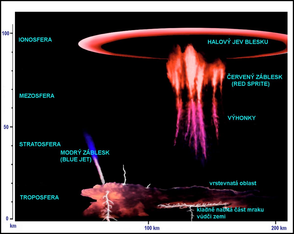 Nadoblačné modré záblesky vystřelují z horní části mohutných bouřkových oblaků až 70 km vzhůru do stratosféry a obvykle se na obloze objeví bezprostředně po úderu kladně nabitého blesku z mraku do země.