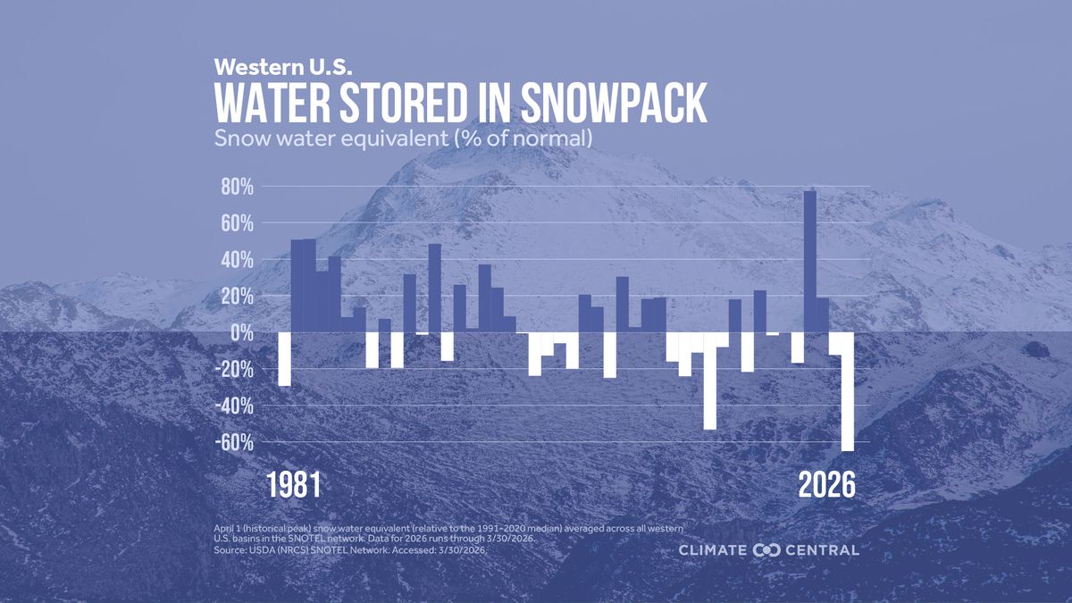 Začátkem dubna, kdy na západě USA obvykle bývá největší množství vody ve sněhu, letos bylo zaznamenáno rekordně nízké množství vodní hodnoty sněhu. Letošní hodnoty jsou podle Climate Central o 65 % nižší, než je dlouhodobý průměr z let 1991 až 2020 a jde o zdaleka nejnižší hodnotu od roku 1981, kdy se začala vodní hodnota sněhu měřit.