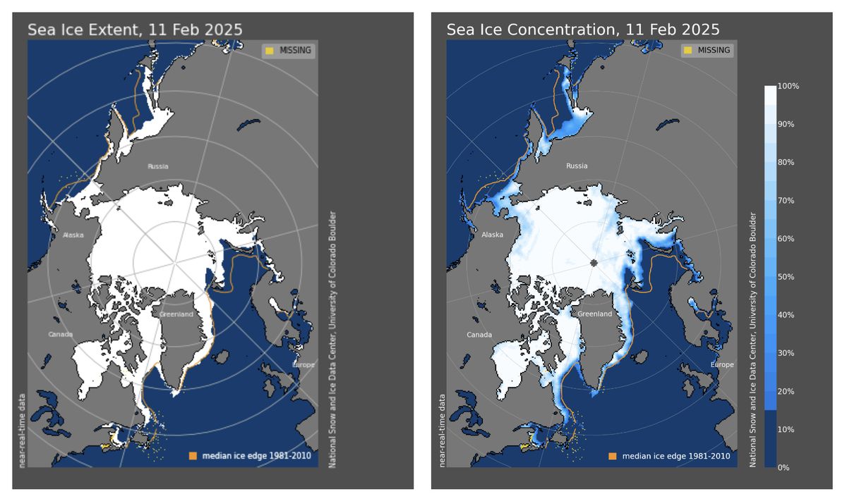 Rozsah arktického mořského ledu k 11.2.2025 (Zdroj: National Snow and Ice Data Center)