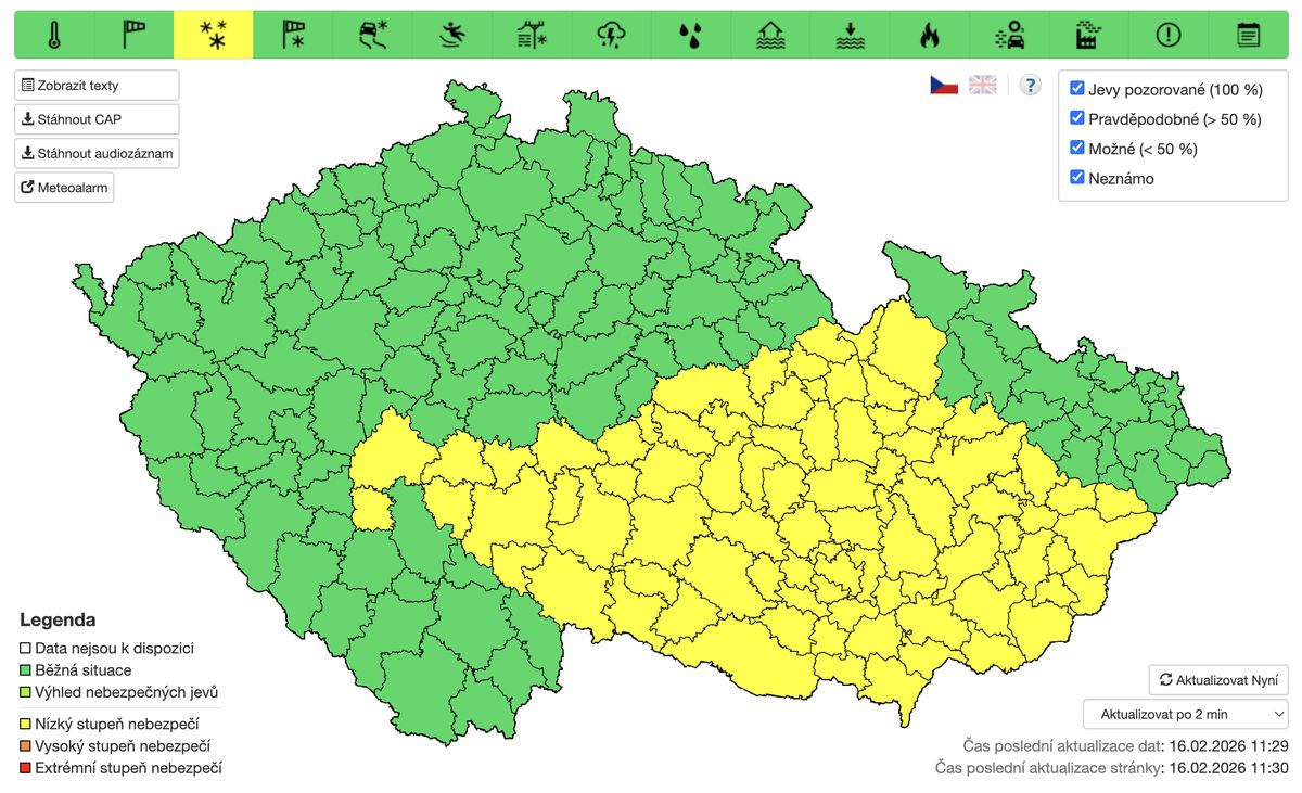 V aktualizované verzi výstrahy už zároveň skončila platnost výstrahy před novým sněhem na západě Čech, kde platil nejnižší stupeň nebezpečí od nedělního odpoledne.
