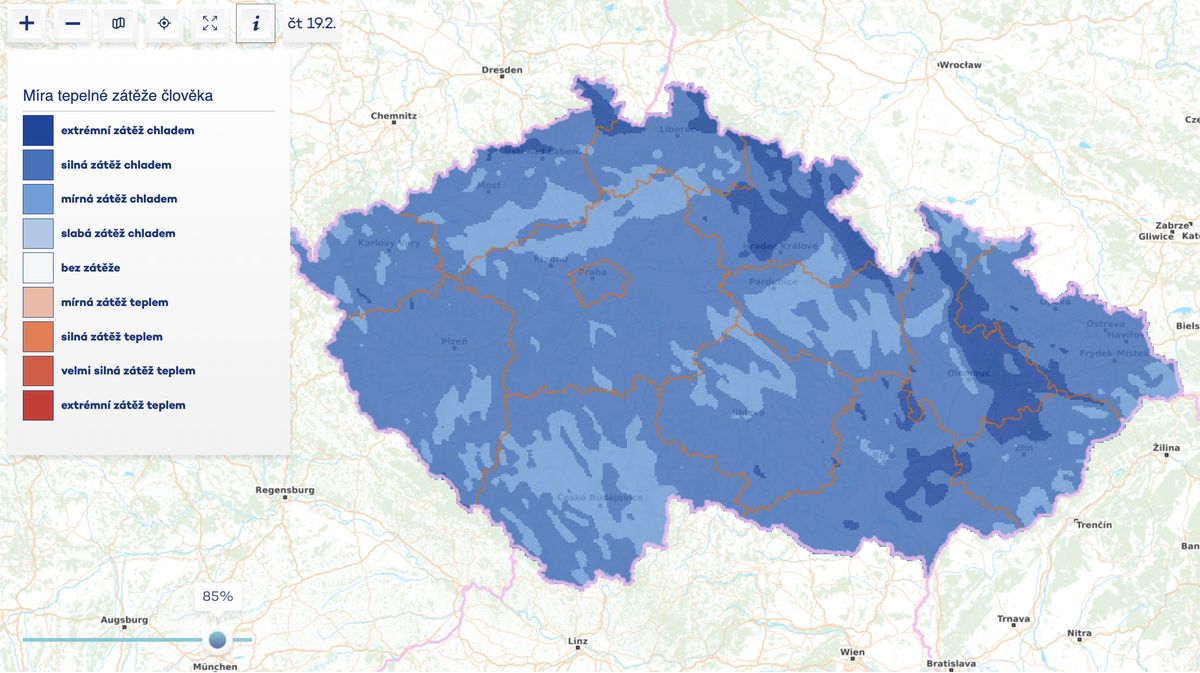 Že bude opravdu nepříjemná zima, ukazuje i mapa ČHMÚ indexu tepelné zátěže na lidský organizmus. V pátek ráno ukazuje zejména pro Moravu a sever Čech extrémní zátěž chladem a silná zátěž zůstane přes den na Moravě a ve Slezsku.