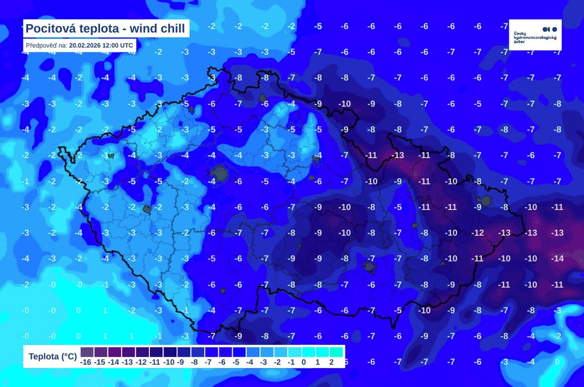 Pocitovou teplotu bude zejména na Moravě o dost snižovat čerstvý vítr o rychlostech 5 až 9 m/s, který může v nárazech dosahovat kolem 15 m/s (55 km/h).