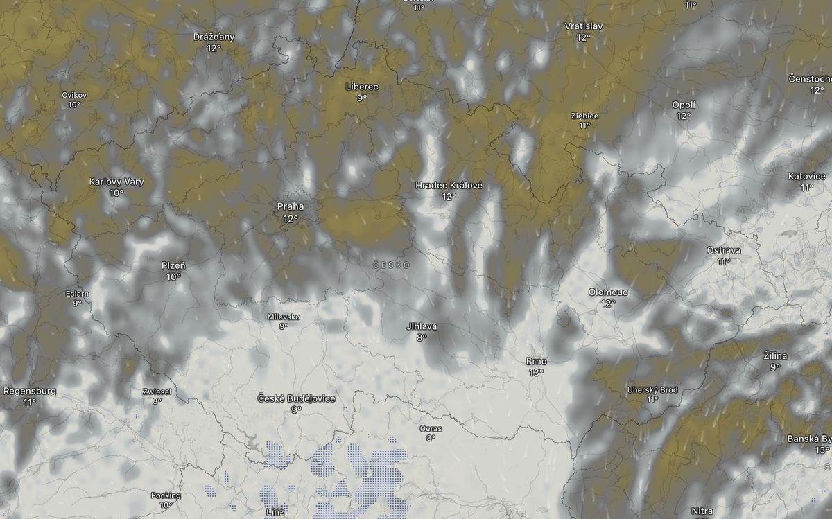Ve čtvrtek bude většinou polojasno, na jihu Čech i Moravy bude více oblačnosti, až zataženo. Na jihu se taky může objevit déšť, od 1000 metrů na horách pak sněžení, přes noc hranice sněžení bude níže, zhruba kolem 800 metrů.