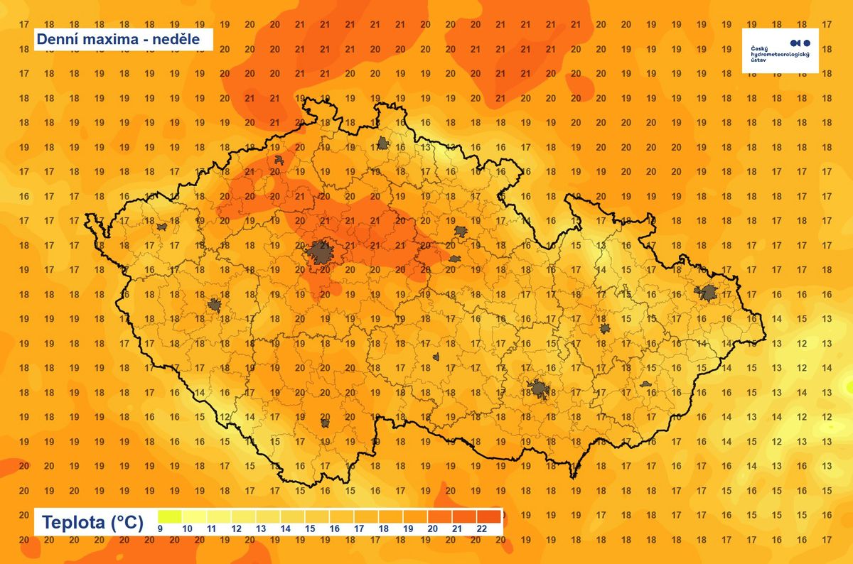 Neděle bude spíše slunečná, ale k večeru od severozápadu bude přibývat mraků. Teploty budou stoupat až ke 20 °C, zejména v Čechách může být na nejteplejších místech i nad 20 °C a i ráno už bude teplé s hodnotami mezi 9 a 4 °C.