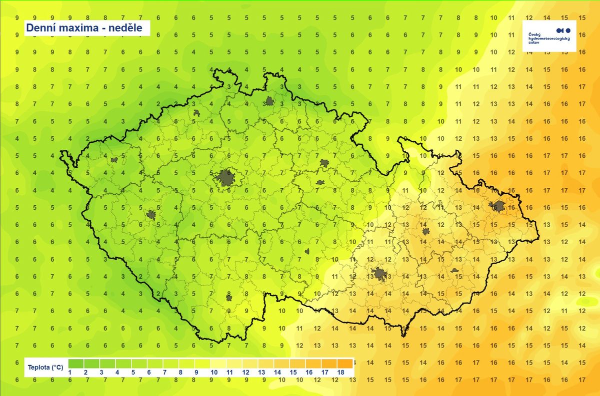 Neděle přinese ještě výraznější teplotní kontrasty mezi západem a východem Česka. Na krajním západě může odpoledne teplota zůstat i pod 5 °C, zatímco na východě se mohou teploty dostat přes 15 °C. Rozdíl teplot tak s velkou pravděpodobností přesáhne 10 °C.