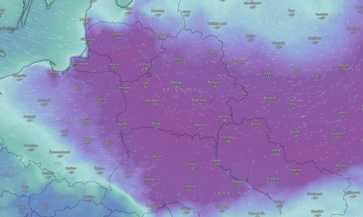 Očekává se, že o víkendu a v pondělí by mohly i přes den být teploty v Pobaltí, v Bělorusku, Rusku a na Ukrajině kolem -20 °C a v noci budou klesat i k -30 °C.