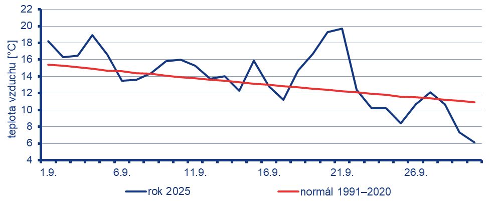 Letošní průměrná teplota v září byla za celé Česko 13,9 °C, což je o 0,9 °C více než je průměr za období z let 1991 až 2020, který se bere jako klimatologický normál. Přesto je září hodnoceno jako teplotně normální.