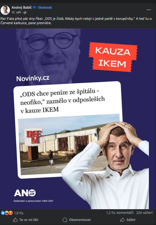 Článek z Novinek, který Babiš 12. září 2025 použil v rámci kampaně na svém facebookovém profilu.
