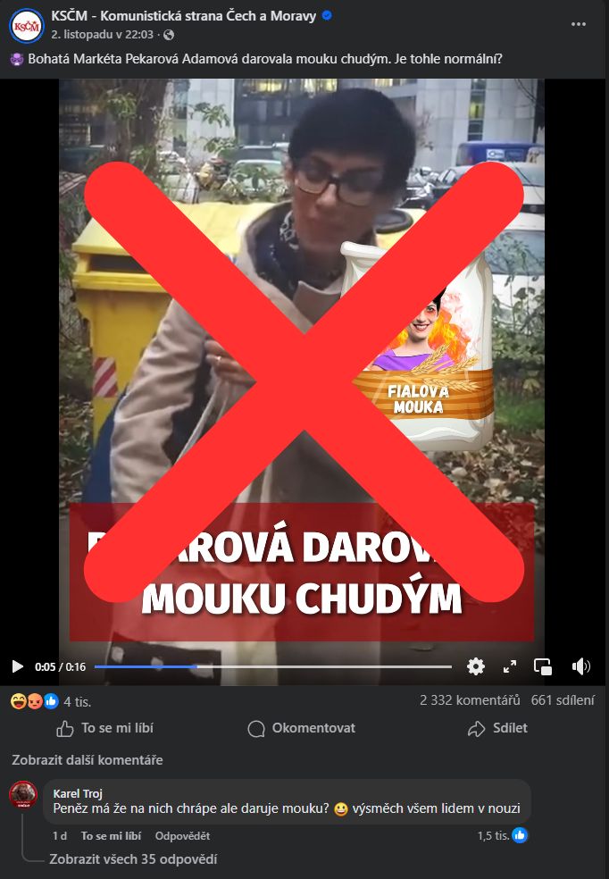 Příspěvek o tom, že „bohatá Markéta Pekarová Adamová darovala mouku chudým“ sdílelo začátkem listopadu z profilu KSČM více než šest stovek lidí, tisíce profilů příspěvek komentovaly a „lajkovaly“. Nápad na zdiskreditování Pekarové Adamové pomocí kilogramu mouky však rozhodně nepochází z hlavy správce sociálních sítí komunistů.