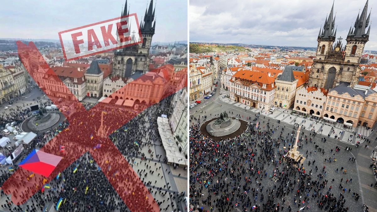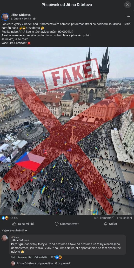 Snímek s prořídlým Staroměstským náměstím a ukrajinskými vlajkami označila autorka za pohled ze Staroměstské radnice, nakonec však přiznala, že vlastně neví, jakou situaci fotka zachycuje. Z diskuze pod příspěvkem je ale zřejmé, že lidé považují obrázek za realitu a dál ho sdílejí.