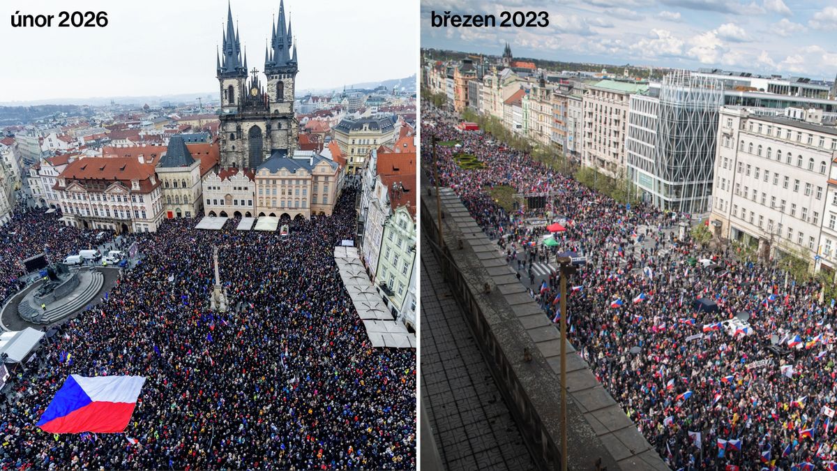 Srovnání počtu účastníků demonstrace z března 2023 a února 2026