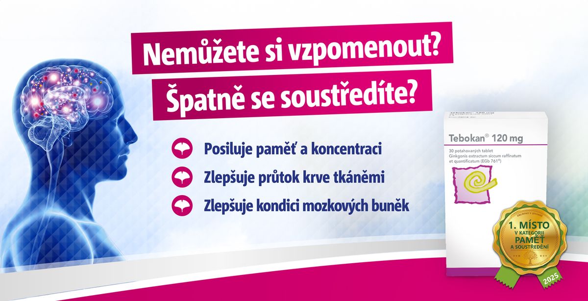*Tebokan® 120 mg potahované tablety je lék k vnitřnímu užití k léčbě poruch paměti a koncentrace. Po poradě s lékařem též k léčbě ušních šelestů, závratí a demence. Účinná látka: extrakt z jinanu dvoulaločného (Ginkgo biloba) EGb 761®. Před použitím si pečlivě přečtěte příbalový leták. Lék můžete zakoupit v lékárně i bez receptu. **Pokud se Vaše příznaky zhorší nebo se nezlepší do 8 týdnů, poraďte se s lékařem. Bez porady s lékařem neužívejte Tebokan 120 mg déle než 3 měsíce.