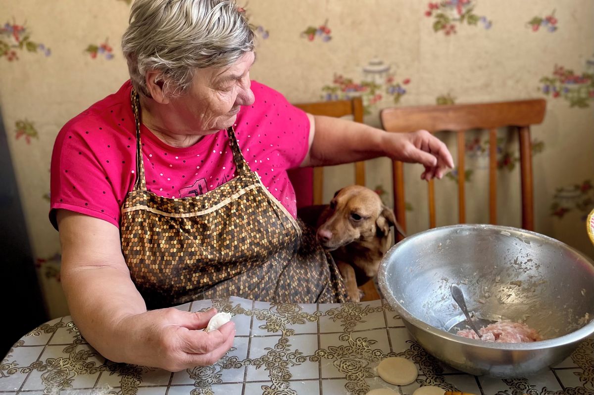 Některá nemohoucí nebo hodně stará zvířata žijí s Aljoninou rodinou přímo v domě, jako třeba právě částečně ochrnutá Olivia. Babičce, která po celou naši několikahodinovou návštěvu vyrábí v kuchyni na stole domácí pelmeně, asistuje pro změnu zrzavá fena jménem Mylady.