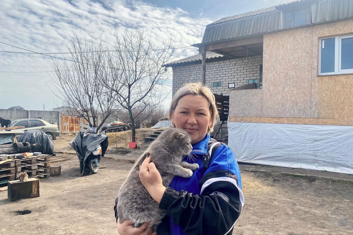 „Nemohla bych je tam nechat. Nerozumím lidem, kteří opustí zvířata jen proto, že se pro ně stanou komplikací. Jsou to živí tvorové a válečné oběti jako my,“ Aljona zvedá do náruče mohutnou šedou kočku, která se nahřívala na dřevěných paletách.