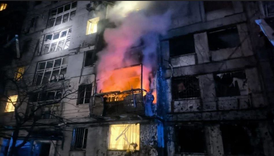 Hořící dům v Dnipru