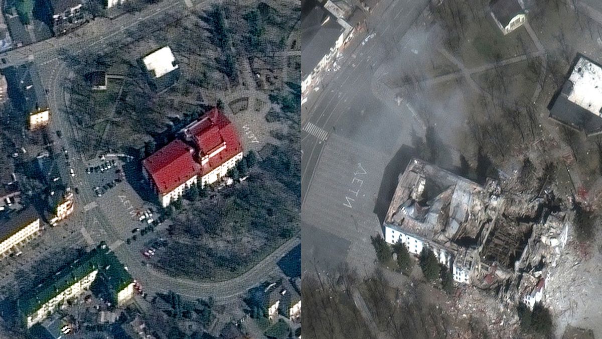 Satelitní snímky mariupolského divadla pořízené společností Maxar. Vlevo záběr ze 14. března 2022, když budova ještě stála a zoufalí lidé se snažili odradit Rusy od bombardování nápisem DĚTI. Vpravo záběr z 29. března dokládající, že Rusy nápis neobměkčil.