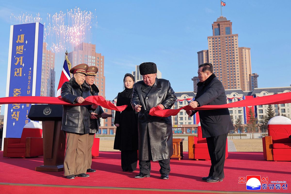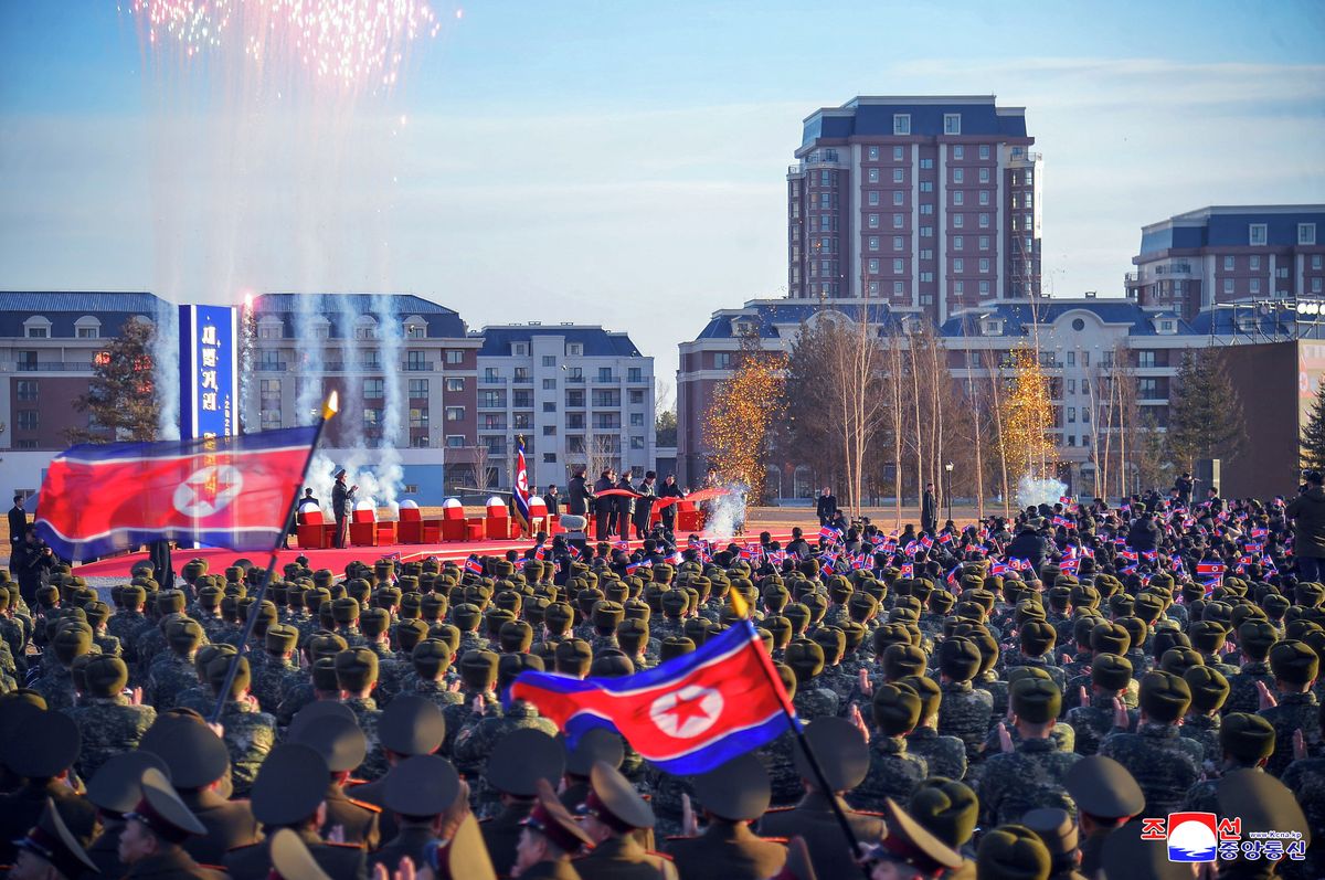 Severokorejský vůdce Kim Čong-un přestřihl pásku dostavěného bytového komplexu, kde získají byty příbuzní vojáků, kteří padli v rusko-ukrajinském konfliktu.