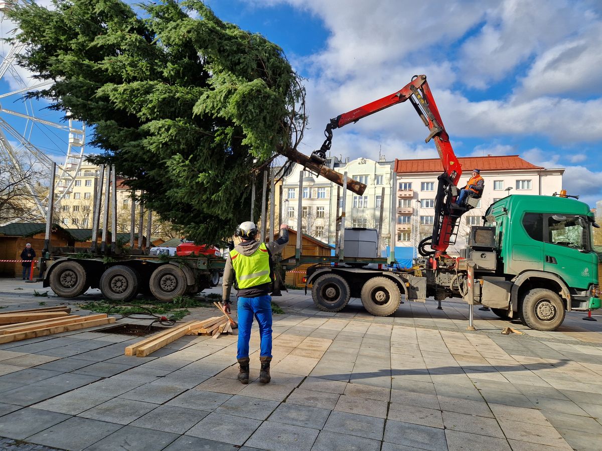 Na centrální Masarykovo náměstí v Ostravě přivezli vánoční strom ve středu 19. listopadu v poledne. Nyní proběhne jeho zdobení.