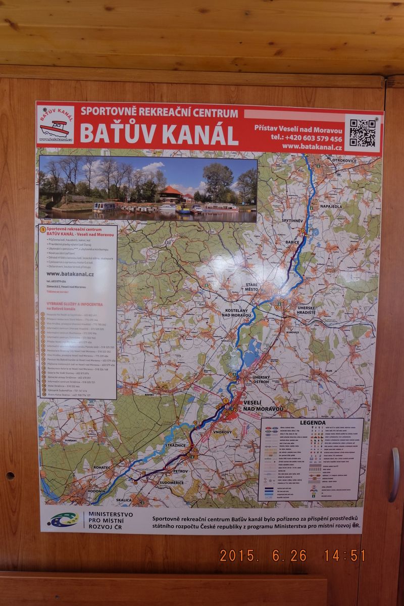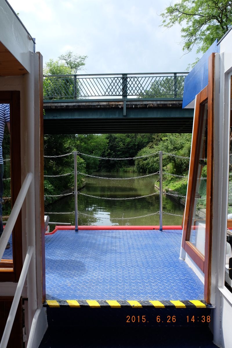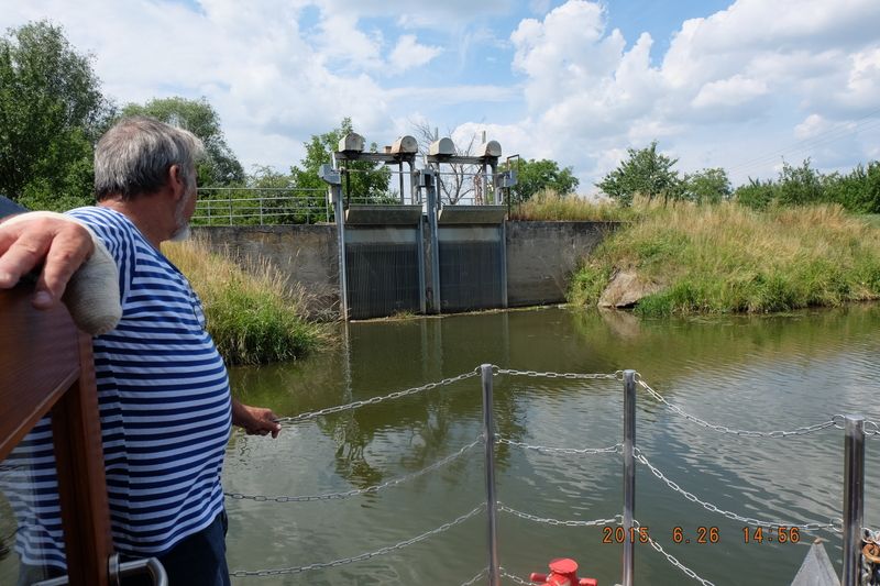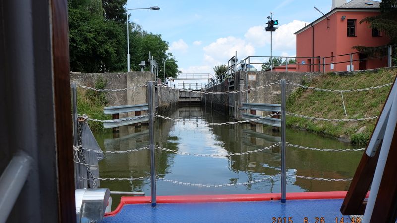 Nejdříve vyjíždíme z přístavu a pomalu se dostáváme na kanál, rychlost je zde omezena na 8 km/h a tak žádný spěch. Vystupujeme na horní palubu a sledujeme okolí kanálu. Hned napravo vidíme výpusť, což byl systém napouštění kanálu a závlahy okolí této unikátní vodní cesty. Upravený kanál i tok řeky Moravy s průměrnou hloubkou 1,5 m skýtá na cestě 13 zdymadel a jeden zdvihací most. Do zdymadla pomalinku vjíždíme a sledujeme, jak se vyrovnává hladina.