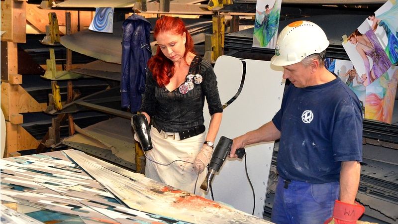 V hale smaltovny byla v pátek 27. dubna pracovní atmosféra. Umělci, kreslili, vyškrábávali, zkoušeli, kombinovali barvy, radili se, ale převážně byli ponořeni do vlastní invenční práce. "Jsem zde poprvé," řekla nám akademická malířka, pedagožka na Akademii výtvarného umění v Praze Markéta Urbanová. "Dojmy z pobytu mám jenom kladné. Jsem malířka, figuralistka. Pracuji s olejem na plátně, ale zde jsem si přišla vyzkoušet novou technologii. Na práci se smaltem jsem se dopředu připravila. Zjistila jsem si od kolegů, jaké jsou technologické podmínky, jak smalt pracuje, jak se mění barvy po vypálení v peci. Příjemně mě překvapilo, že s touto technologií se dá dělat více, než jsem předpokládala," dodala.