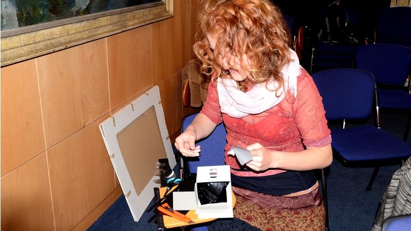 V praktické části byli zúčastnění poučení o tom, co je to dírková komora a jak to vlastně všechno funguje. Na základě nabytých zkušeností si všichni vyrobili své vlastní dírkové komory. Tedy - vybrali si krabičku, krabici, nádobky či jinak vytvarované předměty. Do jedné části připravovaného fotoaparátu udělali dírku, "přístroj" zaslepili tak, aby do něj nemohlo přistupovat světlo, udělali závěrku a v absolutní tmě do přístroje založili obyčejný fotografický papír.
