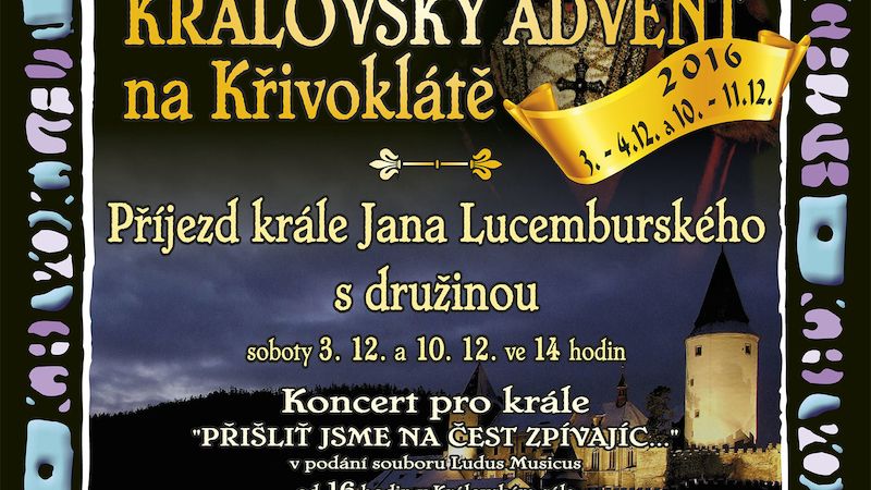 „Oslavy Lucemburského roku na Křivoklátě završí tradičně pořádané adventní programy o víkendech 3. - 4. a 10. - 11. prosince, tentokrát s připomínkou roku 1316, kdy byl na hradě internován malý kralevic Václav známý spíše pod svým pozdějším jménem Karel. Pověstný adventní jarmark s doprovodným programem bývá na Křivoklátě hojně navštíven několika tisíci lidí. Příjezd krále Jana Lucemburského s družinou a odpolední Koncert pro krále dodá letos adventním víkendům zvláštní lesk,” uvedl Mgr. Jan Cieslar, tiskový mluvčí Národního památkového ústavu.