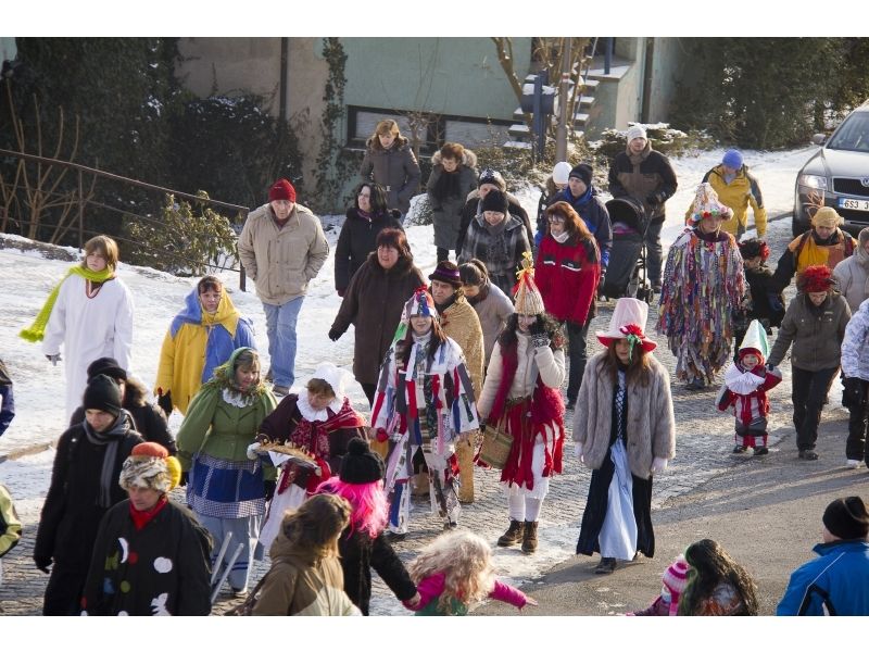 Počasí sice bylo mrazivé, ale kdo chtěl, rád se zahřál tancem, nebo jen výstupem k zámku malebnými uličkami města. Za muzikanty se tak po obci pohybovaly postavy ruznorodého ražení, někdy těžko specifïkovatelné, o to však zábavnější. Nechyběl mědvěd s medvědářem, ženich s opravdu "půvabnou" nevěstou, kterou představoval hodně urostlý mladík, barevní masopustové, pivo, sněhulák, šašek, vodník, kominík, čarodějnice, kostlivec, bába s nůší a mnoho dalších.