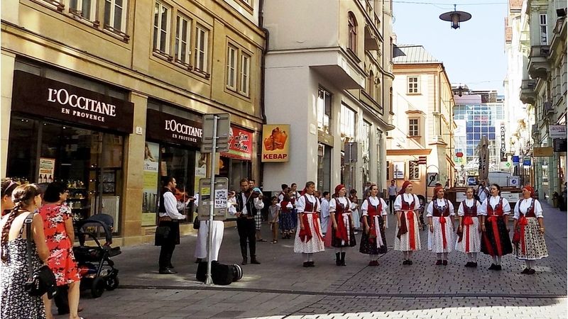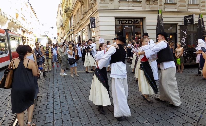 V sobotu dopoledne vystoupily folklorní soubory na pódiu na náměstí Svobody a na rozích ulic Kobližné a Poštovské, Pánské a Masarykovy a Orlí a Masarykovy v pořadu nazvaném Roztančené město.