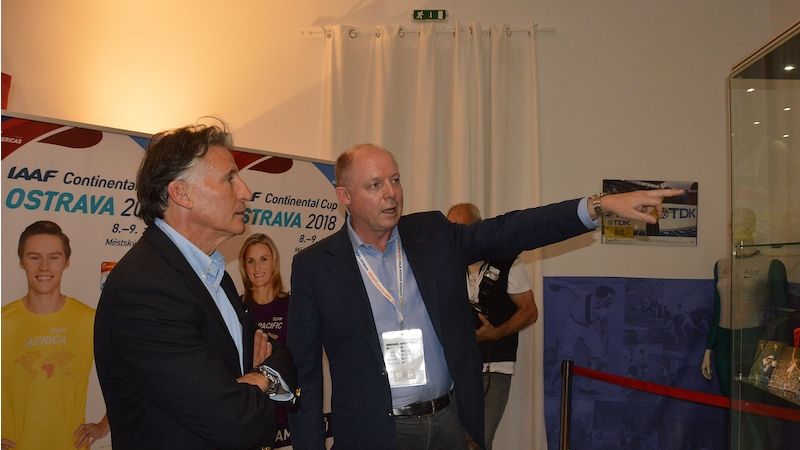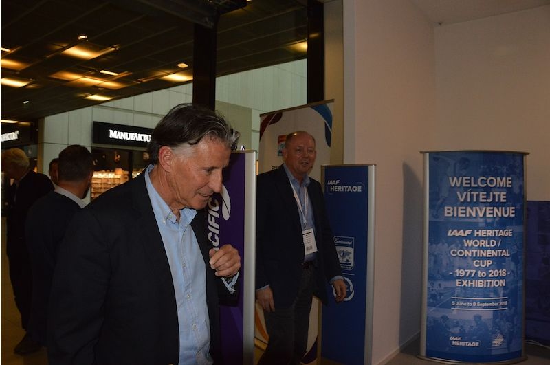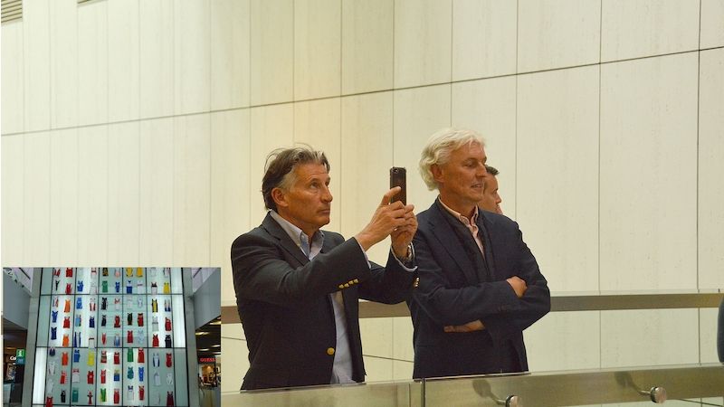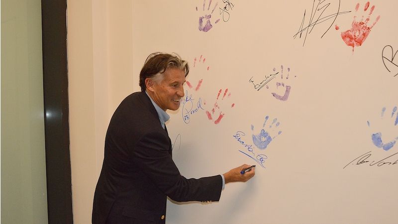 Po absolvování komentované výstavy se Sebastian Coe zvěčnil na panelu otiskem ruky a podepsal se do reprezentační knihy výstavy.