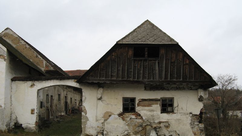 Kaplička, rozpadající se dům a vztyčené kameny