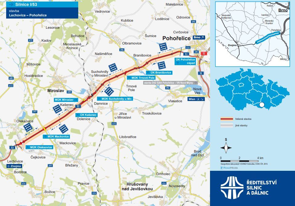 Při rekonstrukci dvacetikilometrového silničního úseku Pohořelice - Lechovice bude rozšířena tato páteřní silnice ve formátu 2 plus 1, vzniknou tedy po celé její délce tři jízdní pruhy.