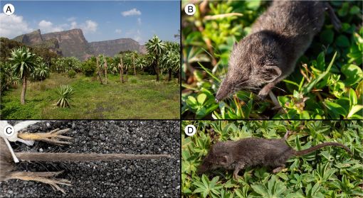 Vlevo nahoře biotop, v němž nově popsaná bělozubka žije, vpravo nahoře a dole snímek tohoto živočišného druhu, pojmenovaného Crocidura stanleyi, a vlevo dole snímek ocásku savce.