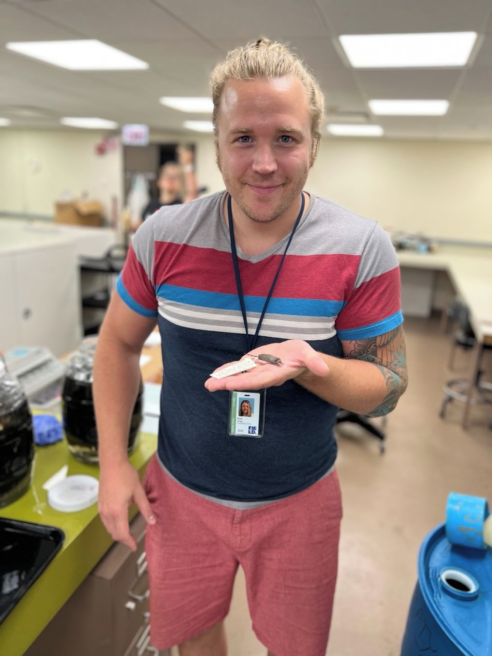 Biolog Evan Craig s vycpanou bělozubkou z muzejních sbírek