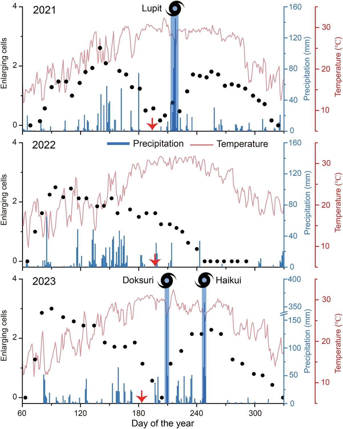 Časová variabilita zvětšování buněk borovice Massonovy (černé tečky) a srážek (modré sloupce) a teploty vzduchu (červená čára) na hoře Čchang-an-šan během tří vegetačních období 2021–2023. Černé symboly označují jednotlivé tropické cyklony (spolu s názvy), modré stínování srážky související s cyklonami a červené šipky začátek tvorby pozdního dřeva.