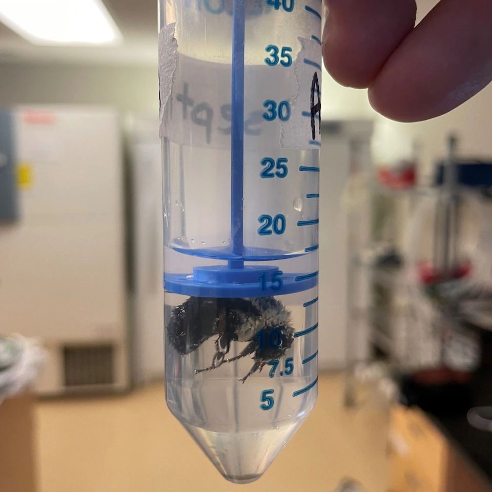 Čmeláčí královna ponořená ve vodě v laboratorních podmínkách