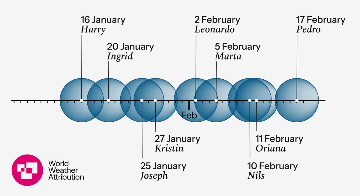 Rekordní série zimních bouří začala 16. ledna pojmenováním bouře Harry. Následovala zdánlivě nekonečná řada systémů Ingrid, Joseph, Kristin, Leonardo, Marta, Nils a Oriana, kterou v polovině února uzavřel Pedro. Rekordní sezona navíc bude pokračovat další bouří.
