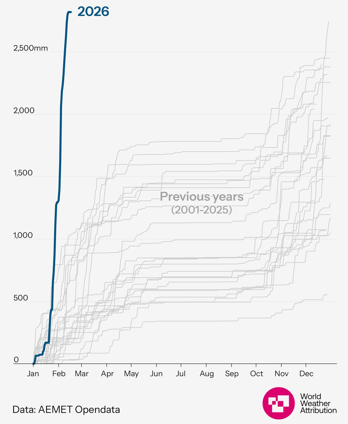 Množství srážek bylo na některých místech bezprecedentní. Ve španělské Grazalemě, která se stala symbolem letošní série, spadlo během jediného měsíce téměř 3000 milimetrů srážek, tedy více, než činí historicky nejvyšší zaznamenaný roční úhrn.