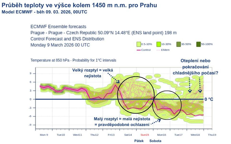 Rozptyl jednotlivých běhů ansámblu ukazuje možné scénáře a míru nejistoty.