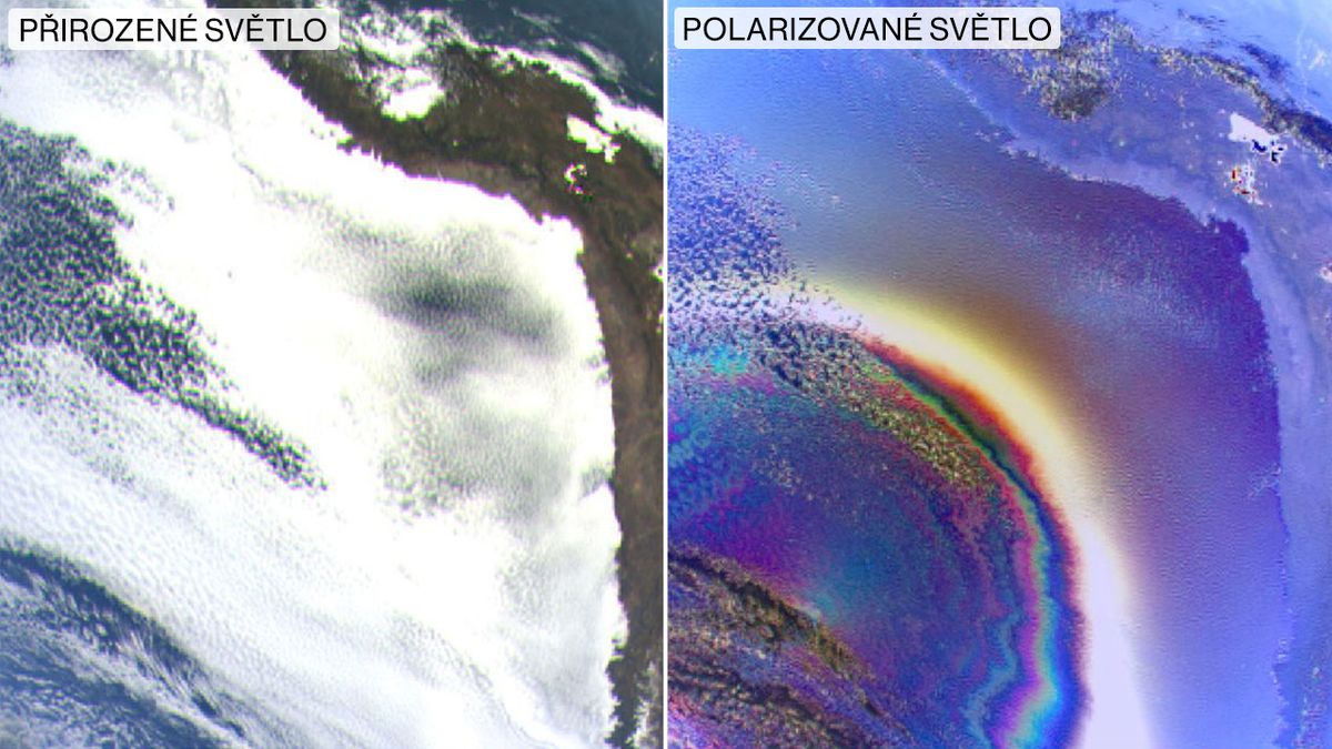 Oblačná struktura nad Chile a Peru: atmosférický útvar známý jako oblačný oblouk. Je podobný duze a tvoří ho sluneční světlo interagující s drobnými kapičkami vody v mracích. Na snímku v přirozeném světle (vlevo) je příď oblačnosti sotva viditelná, na snímku v polarizovaném světle (vpravo) je vidět živě.